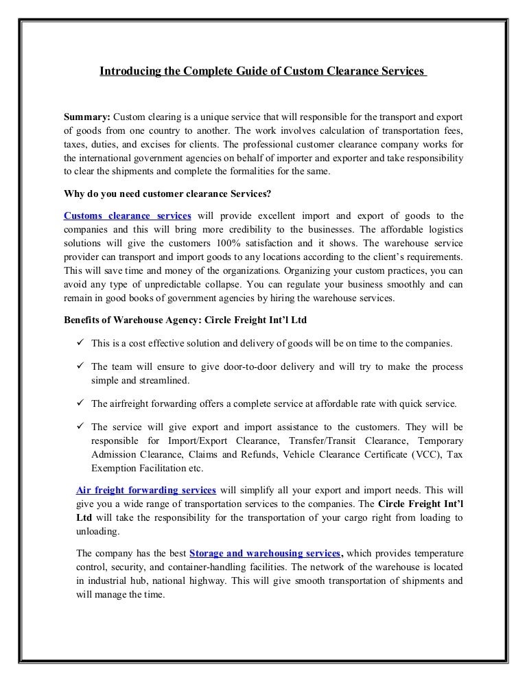 Purpose of the programme This programme will equip the individual with skills required for the safe handling of freight, and to adhere to customs compliance regulations, which will assist companies in saving costs by establishing worldclass supply chains with competent employees. Every time you ship internationally, you’ll need to take a few additional steps to prepare your shipment for the customs clearance process Customs, the government service responsible for administering international trade laws, inspects and regulates every shipment to make sure the contents comply with the importing country or territory’s regulations. We want you to have a good experience moving through the CBP clearance process Learning about traveler entry forms, agricultural products allowed and prohibited, what items are dutiable, and other information about the process will help you move speedily through the CBP processCBP Reminds Travelers from Canada that Marijuana Remains Illegal in the United StatesCBP Expands.