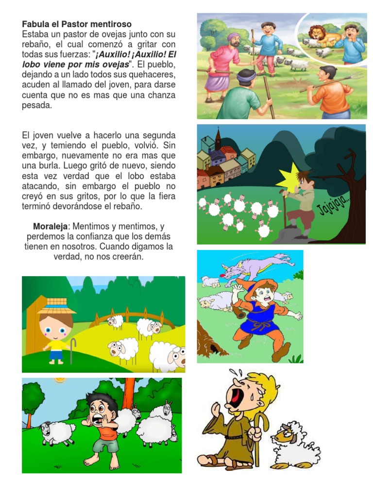 Fábulas con enseñanzas El Pastor Mentiroso Fábulas infantiles Fábulas con enseñanzas Cuentos infantiles Un pastor que apacentaba sus ovejas en una montaña, pedía muchas veces socorro a los labradores que trabajaban en los campos vecinos, gritando que venía el lobo acudiendo estos a su socorro nada encontraban, y se volvían a su trabajo. Lenguaje y comunicación unidad didáctica El Pastorcito Mentiroso (cuento y actividades) 78 años by nevena_novakovic_1. Cuento El Pastor Mentiroso Erase vez una pastorcillo que apacentaba sus ovejas en una montaña , cuando de pronto ¡El lobo!.