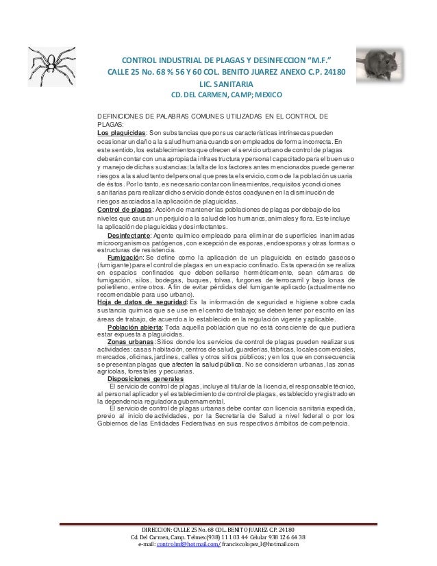 O con medidas preventivas cuando hay ausencia de la misma El motivo del plan de control de plagas es mantener el espacio libre y protegido de organismos plaga e impedir su acceso Control periódico de plagas. Muchos ejemplos de oraciones traducidas contienen “plan de control de plagas” – Diccionario inglésespañol y buscador de traducciones en inglés. Plan de control de plagas TKC basa sus servicios en la implementación de programas de control de plagas, concepto más responsable con la salud humana y el cuidado del medio ambiente Nuestros programas de control de plagas involucra la implementación de un conjunto de métodos tales como físicos, mecánicos, químicos, biológicos.
