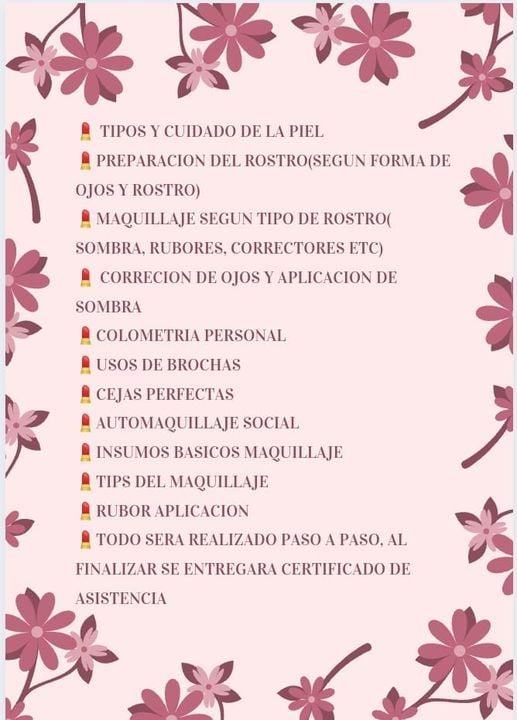 Cursos de Automaquillaje y para maquillar a otros personas con los expertos en la materia a los mejores precios promoción comienzo de año Incluye certificado de asistencia y manual de maquillaje A domicilio o en studio aparta tu citaAprende de los mejores. Cusos de Maquillaje Profesional con materiales incluidos, disctado en academia Certificada y por profesionales venezolanas en estetica 6 particiantes por grupo Maquillaje Para novia, noche, dia tv, fotografia, Smoky Eyes, Automaquillaje, Ext de pestañas, perfilado de cejas y mas. MODELO DE CERTIFICADO DE ASISTENCIA A CURSO Certificado de AsistenciaDMario Cardenas LoaizaDirector de SPANGLISH ACADEMY.