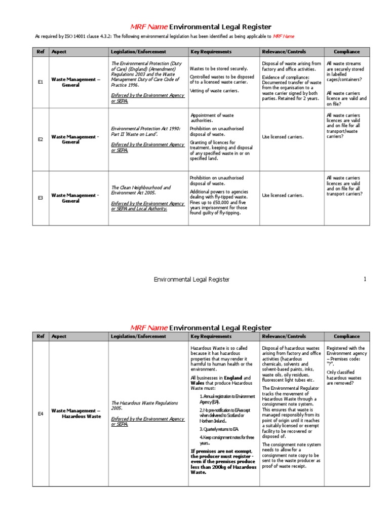 Legal Register Environmental Legislation Environmental Compliance Contractors Sub Contractors