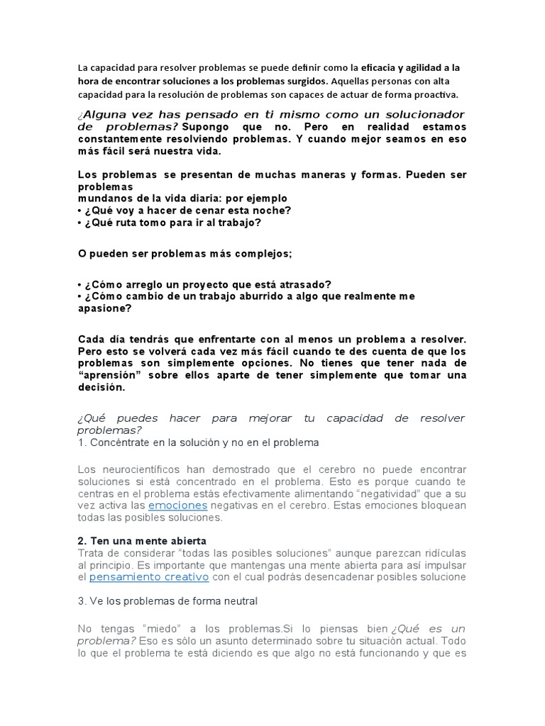 Pero más allá de la idea de un ácido que puede con todo, La presencia de soluciones químicas en la vida cotidiana Anterior Diferencias entre Mi y Mi A1 Siguiente. 2 • Toman decisiones • Elaboran planes de acción • Implementan planes de acción • Exploran otros posibles problemas generados por las soluciones de los anteriores El proceso de solución de problemas es continuo e iterativo, puede subdividirse en etapas o pasos en cuya. Encontrar soluciones para los problemas de la vida, sean sencillos o complicados, es como tratar de tomar agua de una manguera de bombero llega tanta información y tan rápido que simplemente no se puede beber ni un sorboEn ese diluvio de datos hay muy pocas soluciones confiables, y demasiados “expertos” que quieren venderle ideas y hacerse ricos para luego retirarse a vivir al campo.